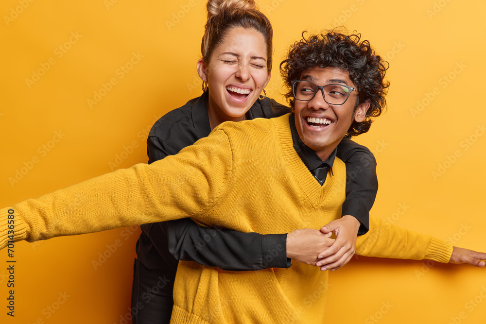 Positive woman and man give piggyback ride embrace and laugh happily dressed in casual clothes pose against vivid yellow background. Boyfriend and girlfriend foolish around together during free time