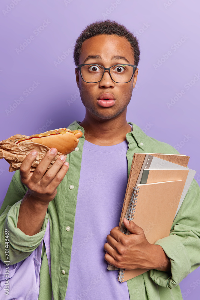 Stunned college student holds hot dog and notepads finds out shocking news cannot believe own eyes wears casual green shirt isolated over purple background. Snack during break at school or university