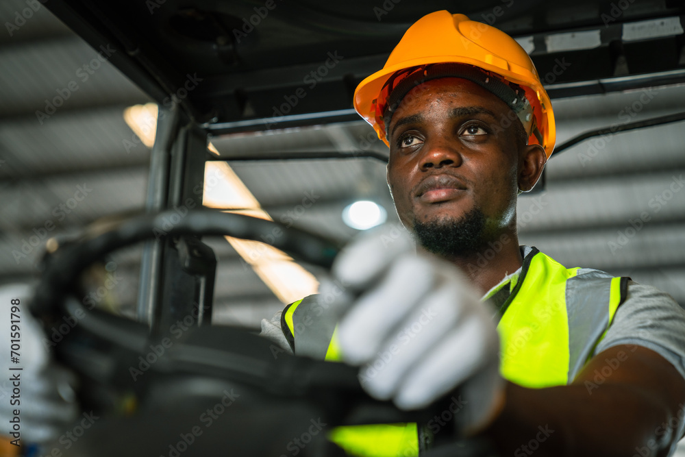 African forklift driver focused on carefully transporting stock from shelves of a large warehouse wearing a helmet and vest looking toward goods