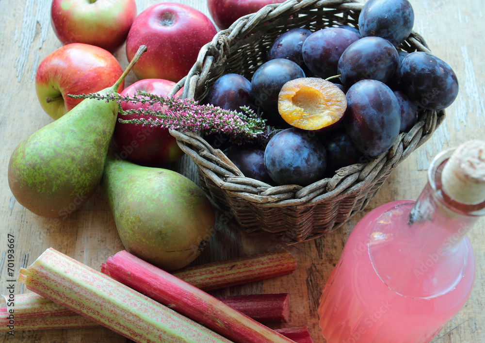 Variety of autumn fruits - apples, pears, plums and rhubarb