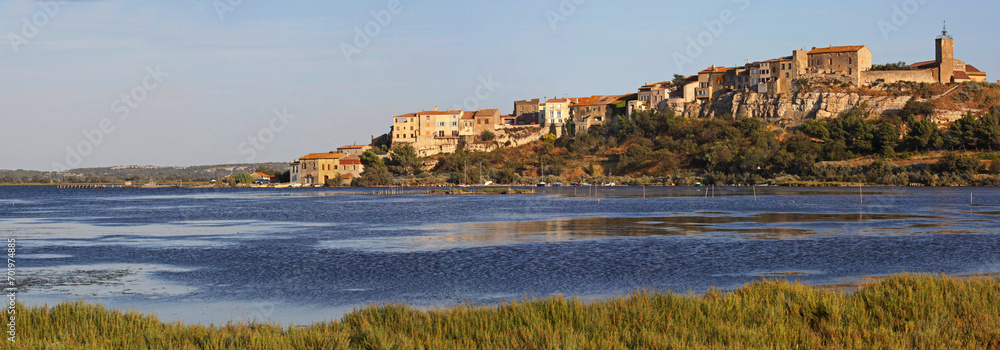 Photo Bages village étang de Bages Aude lagune littoral audois Languedoc Roussillon Occitanie Sud de la France photographie panoramique colline et habitations en bordure d'un lac