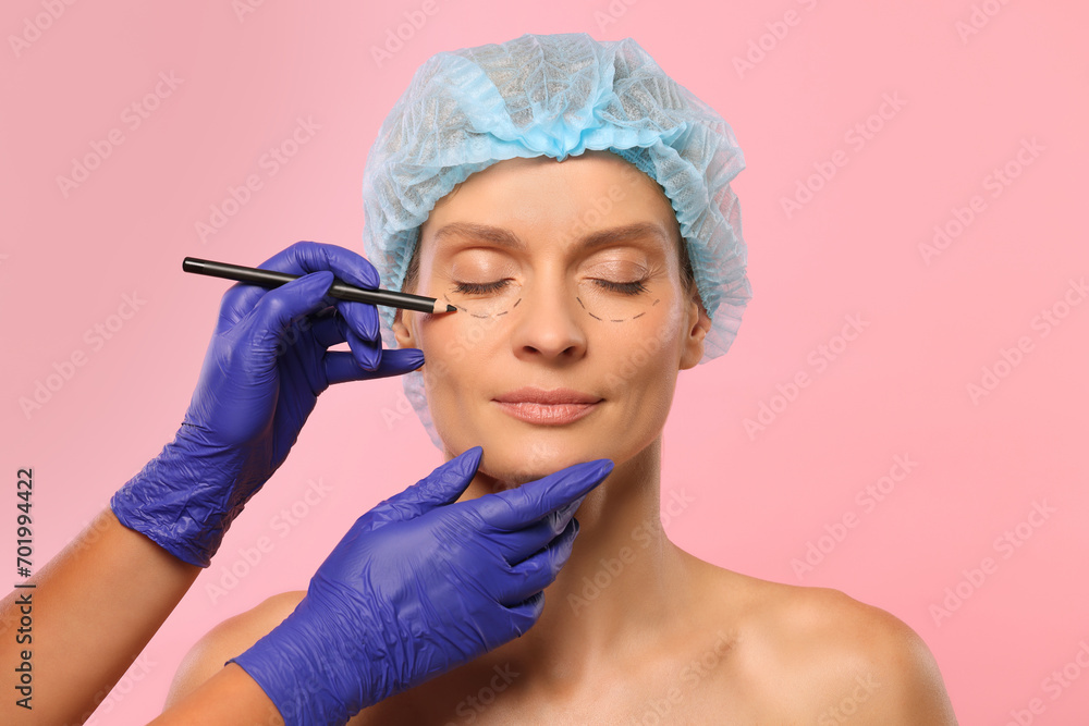 Doctor with pencil preparing patient for cosmetic surgery operation on pink background