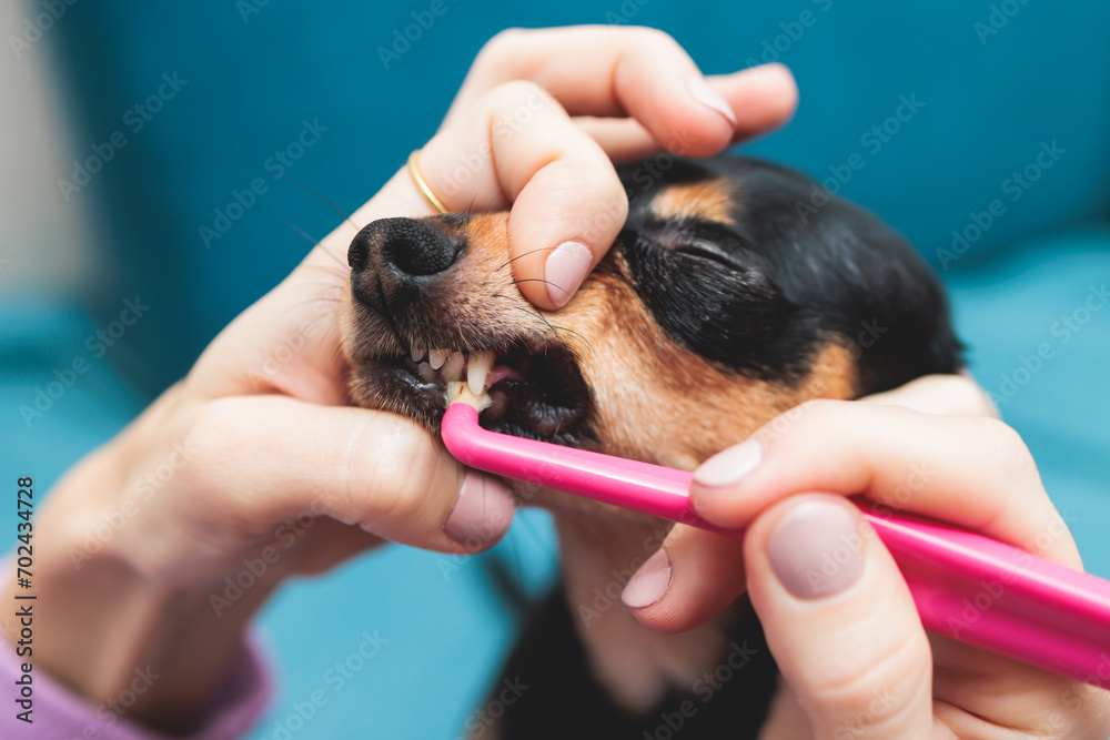 Veterinarian specialist holding small dog and cleaning whitening dog teeth at home with toothpaste dental floss, small black young dog tooth hygiene dental domestic treatment, view of hands