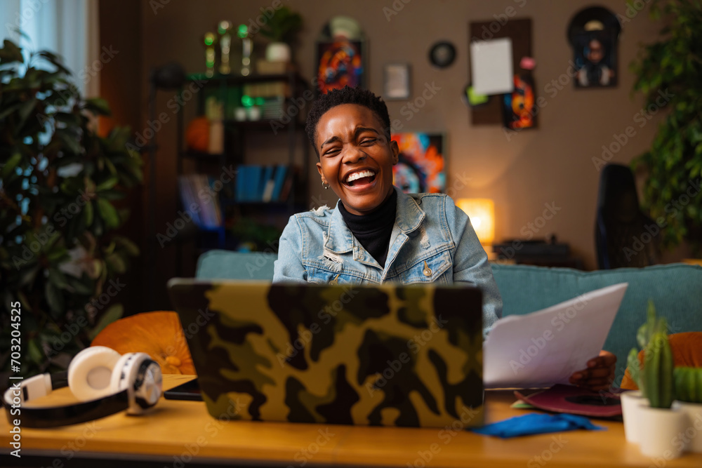 Delighted afro american dark skinned woman working online sitting in front of the laptop smiling observing papers work online from distance freelancer concept.
