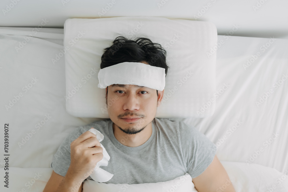 Top view of Asian man got sick with towel on forehead, man flu, man symptoms, holding tissue running nose, resting alone on white bed alone in room.