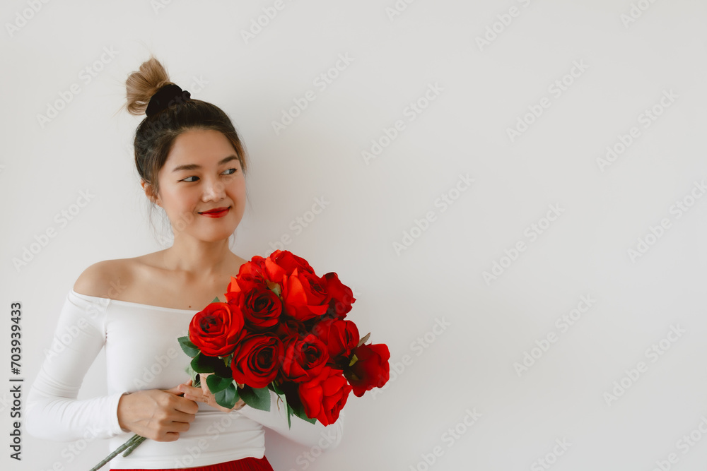 Asian woman wear white, red lips holding red roses, Happy smiling looking at empty space, standing isolated over white background wall.
