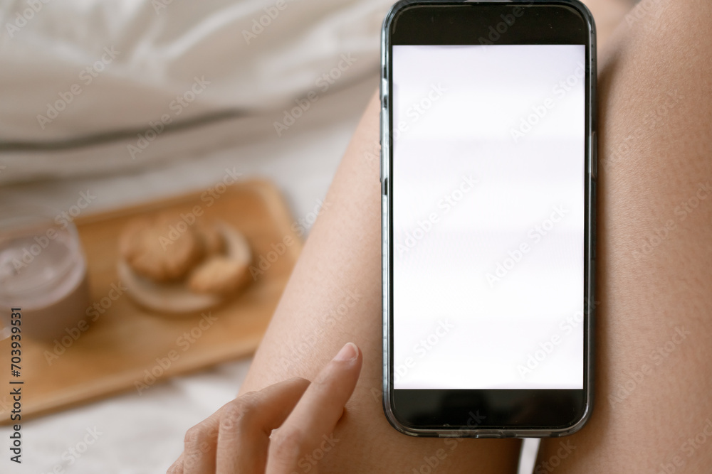 Image of phone showing white screen display, woman using and putting mobile on her legs, sitting on white bed white eating cookie and coffee.