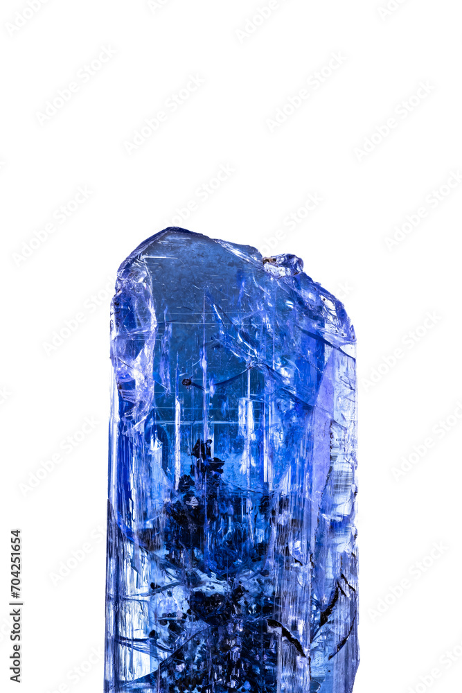 gemmy tanzanite (blue violet zoisite) isolated photography on white blackground. macro detail background. close-up Rough raw unpolished semi-precious gemstone.