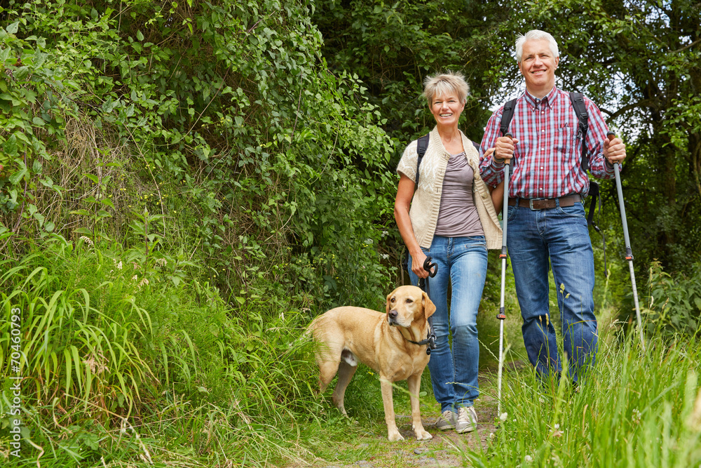 Paar Senioren wandert mit Hund