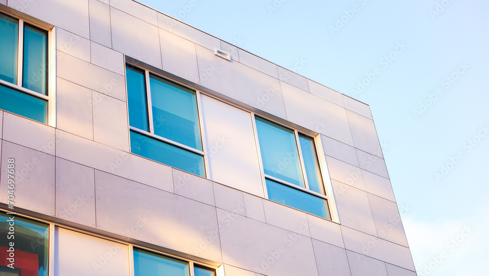 Dynamic modern cityscape with towering commercial buildings against a vibrant sky