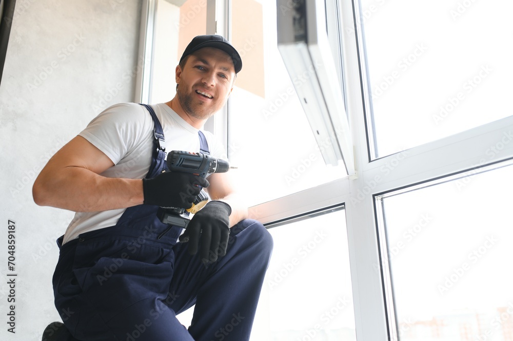 handsome young man installing bay window in new house construction site