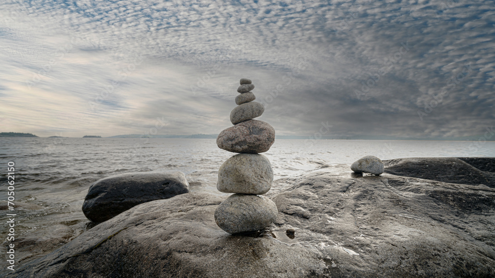 Stacked Rocks balancing, stacking with precision. Stone tower on the shore. Copy space