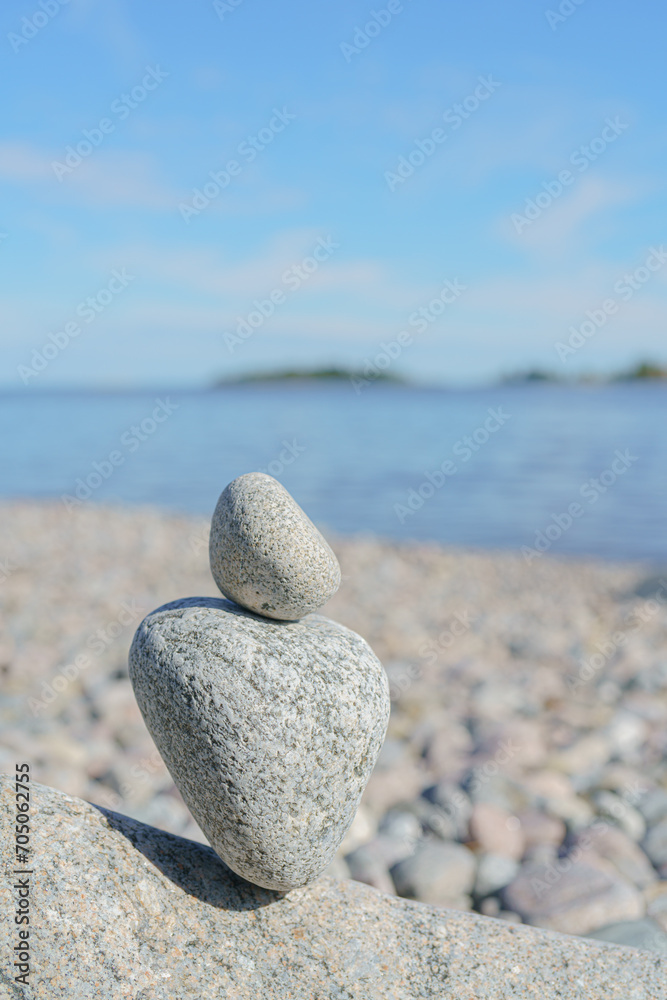 Stacked Rocks balancing, stacking with precision. Stone tower on the shore. Copy space