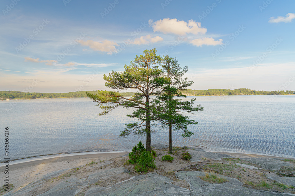 Rocky lake shore on a summer day.