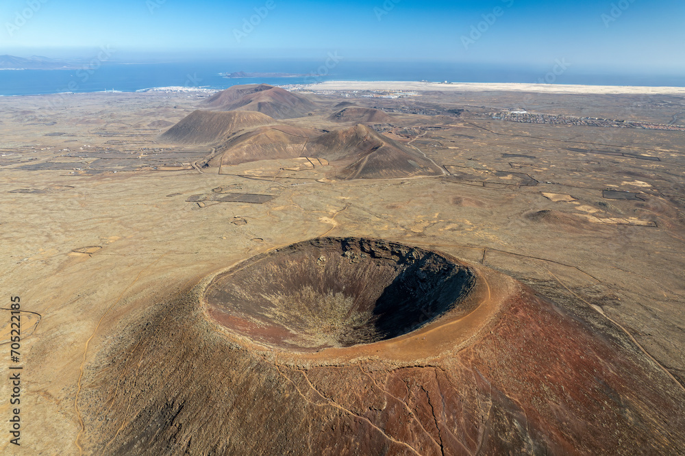 The drone aerial view of Calderon Hondo in Fuerteventura Island, Spain. The Calderón Hondo is a volcano on the Spanish Canary Island of Fuerteventura in the Atlantic Ocean.