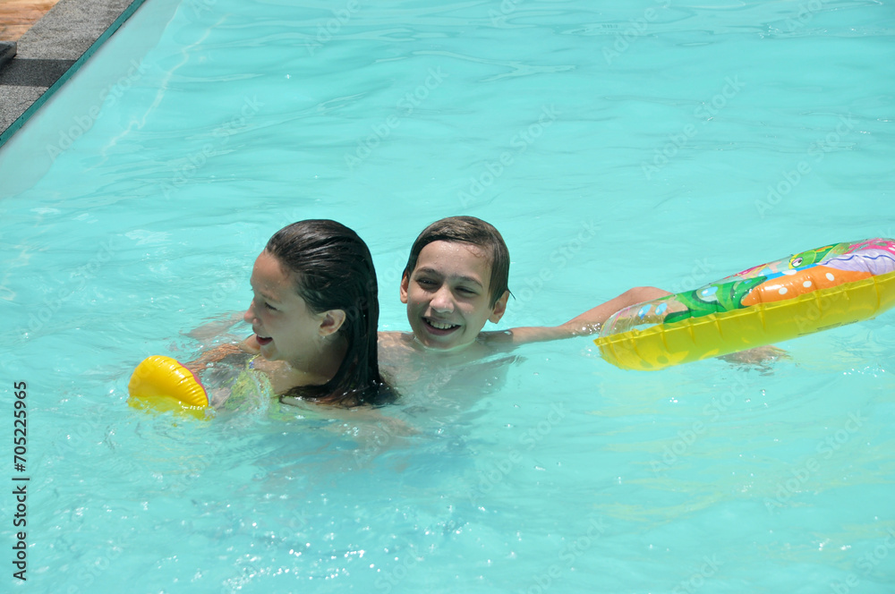 irmãos brincando em piscina, felicidade e diversão na água, férias de verão
