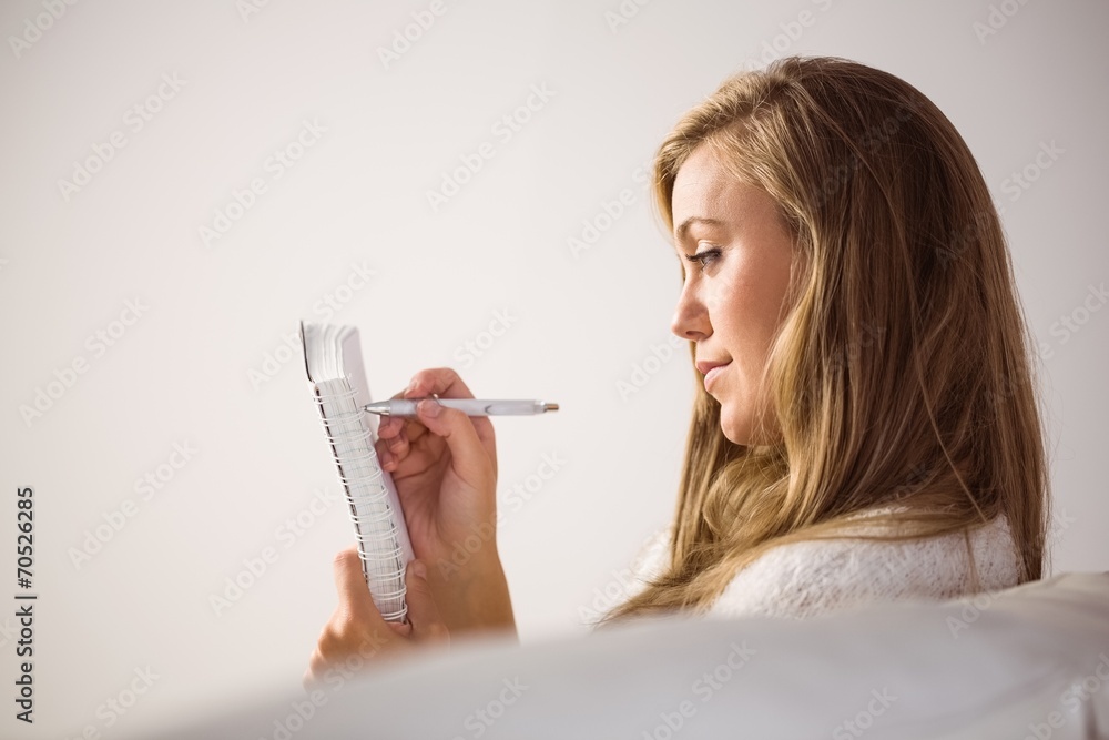 Pretty blonde relaxing on the couch writing in notepad