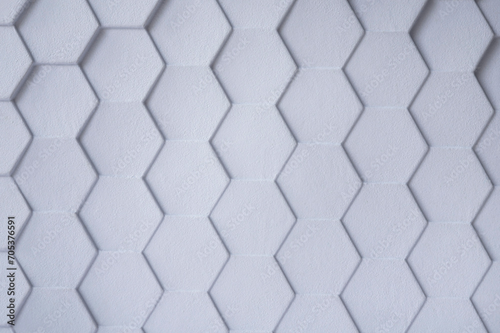 Geometric shapes in the form of a hexagon on a white polyurethane surface. Abstract unusual close-up background of protruding and sinking repeating shapes on a rubber surface.