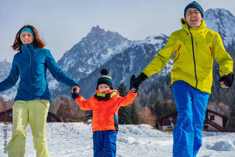 Winter fun with son in snowy foggy mountains during vacations