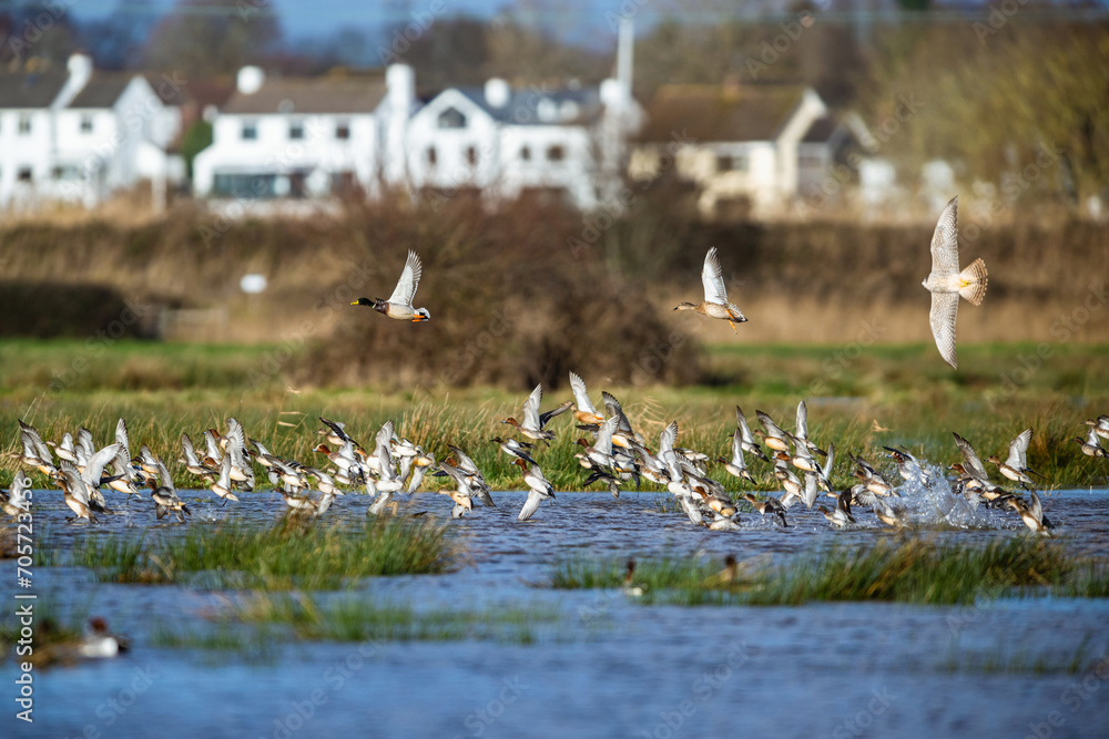Peregrine Falcon during an attack on a flock of ducks, Eurasian Wigeon and Eurasian Teal
