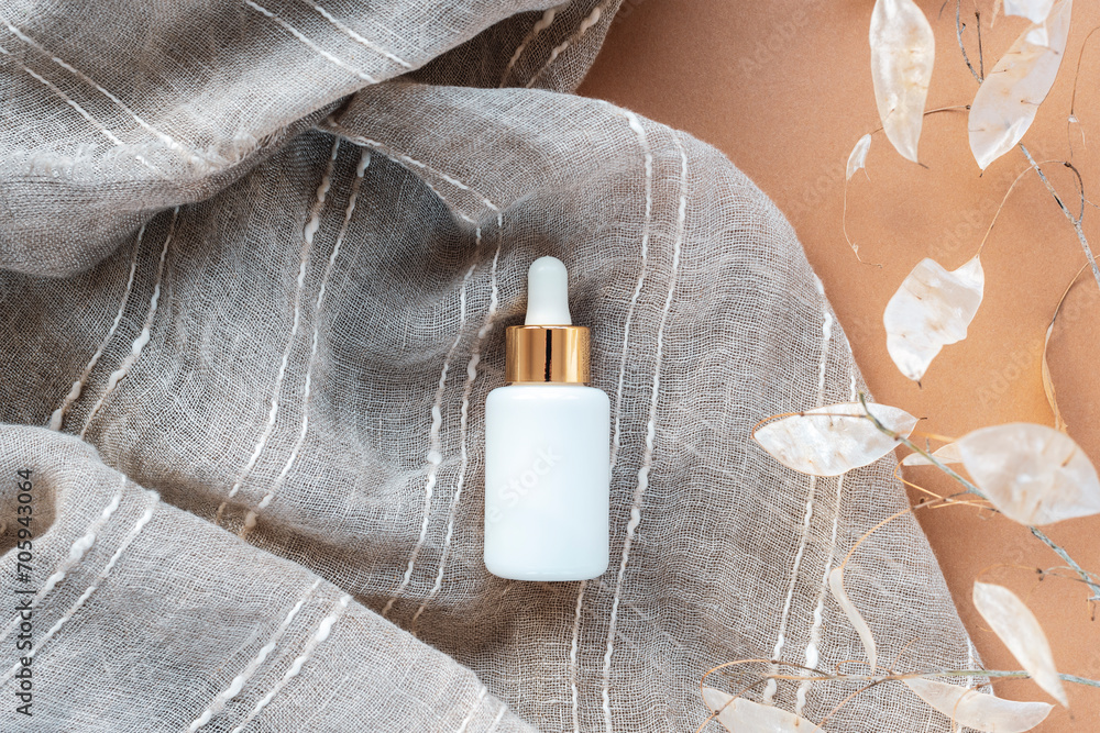 White serum bottle on beige fabric with lunaria dry flowers. Natural cosmetics concept. Top view, flat lay