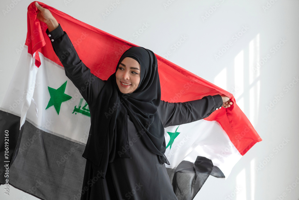 Happy Muslim woman wears black Hijab Muslim traditional clothes holding Irag flag, sunlight and shade on white wall, Muslim woman rights concept