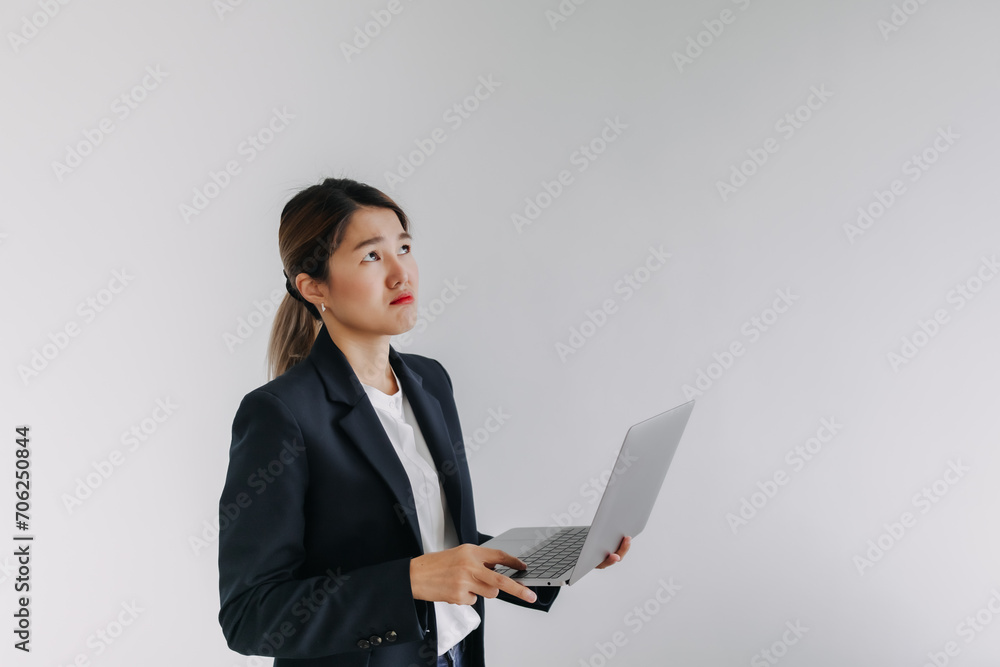 Unhappy asian Thai woman wear blazer suit, looking above at empty space with sad bored face, dislike holding laptop computer, standing over white background wall.