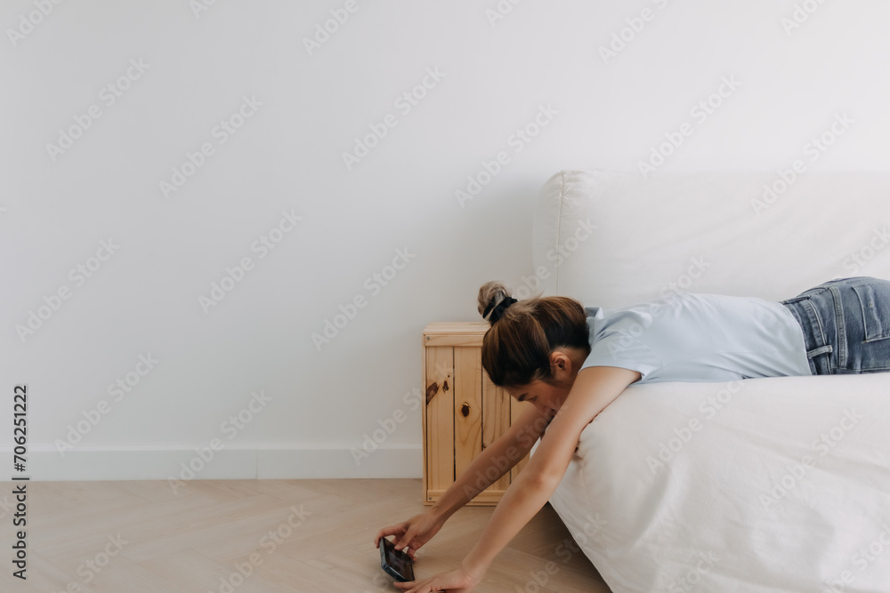 Asian young Thai woman lying stomach on white sofa, using mobile phone alone in room apartment, spending free time.