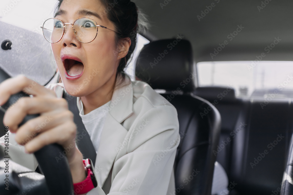 Front view of asian Thai woman shocked face and screaming of car crashing accident on road while driving go to work.