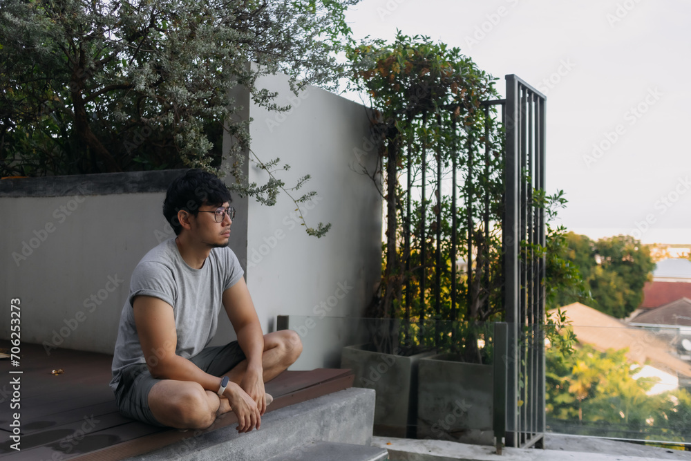 Asian man with beard sitting at poolside alone in summer, thinking something, looking out at swimming pool apartment.