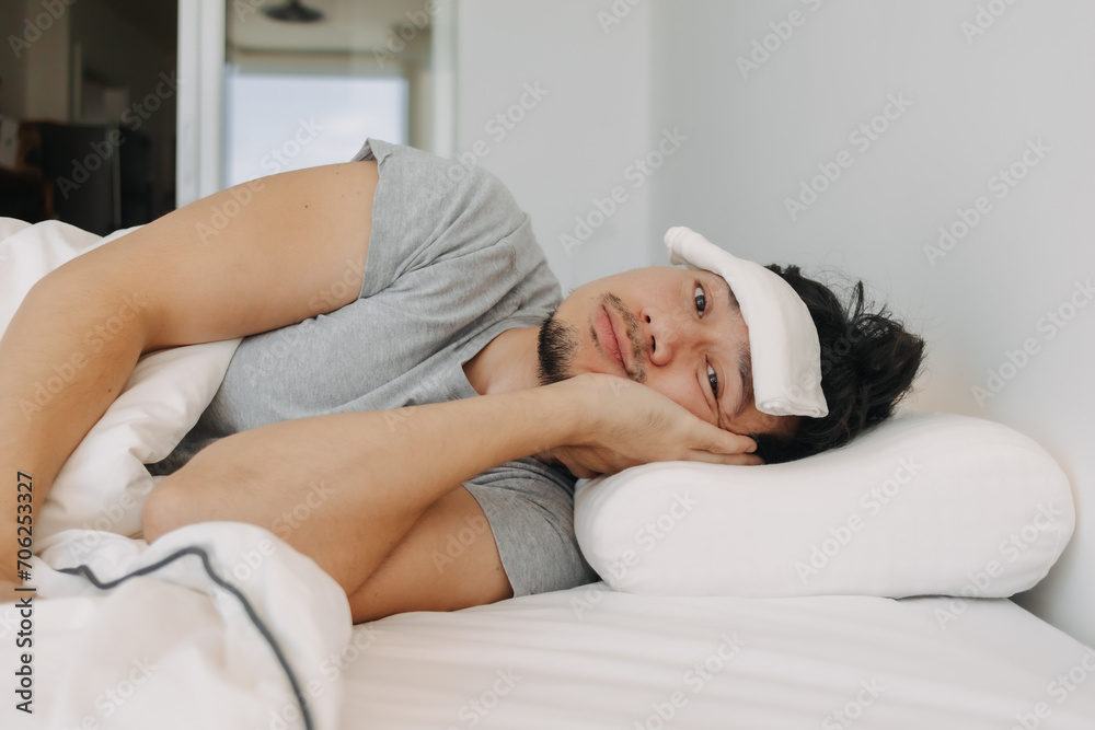 Side view of Asian man getting sick, man flu, overworked put white towel on forehead, bad symptom, resting and lying on white bed alone in apartment.