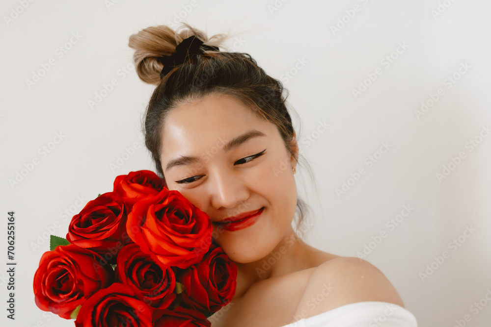 Close up of pretty Asian Thai woman holding red roses on valentines, taking selfie with happy smiling, flowers isolated over white background wall.