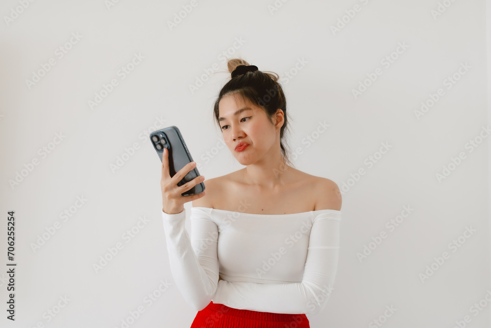 Unhappy Asian Thai woman wear white with bun hair, holding phone with dislike face, standing isolated over white background wall.