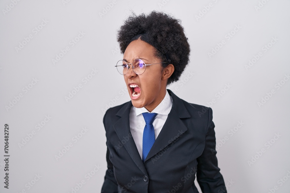 Beautiful african woman with curly hair wearing business jacket and glasses angry and mad screaming frustrated and furious, shouting with anger. rage and aggressive concept.