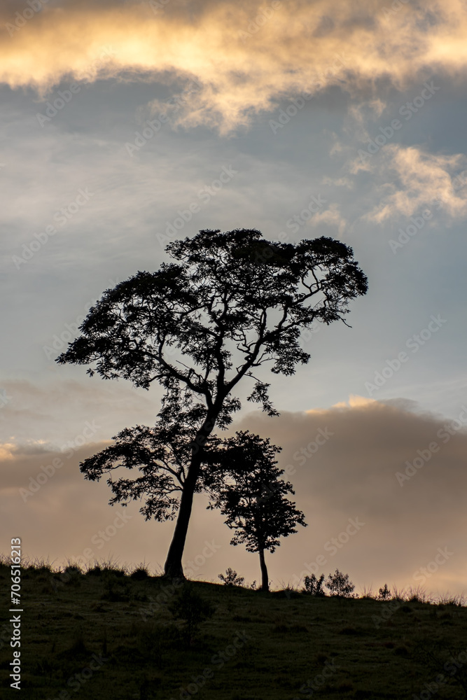 A lonely tree on top of a mountain, against a beautiful sunset sky and hill top.