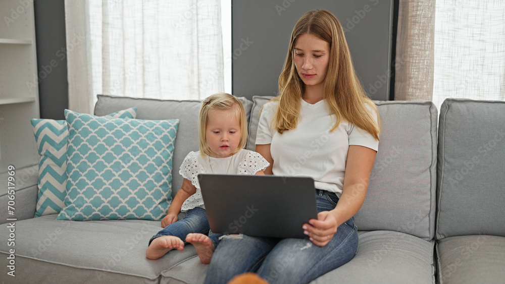 Serious caucasian mother and little daughter engrossed, chilling on their living room sofa at home, completely absorbed in watching an intriguing video on their laptop.