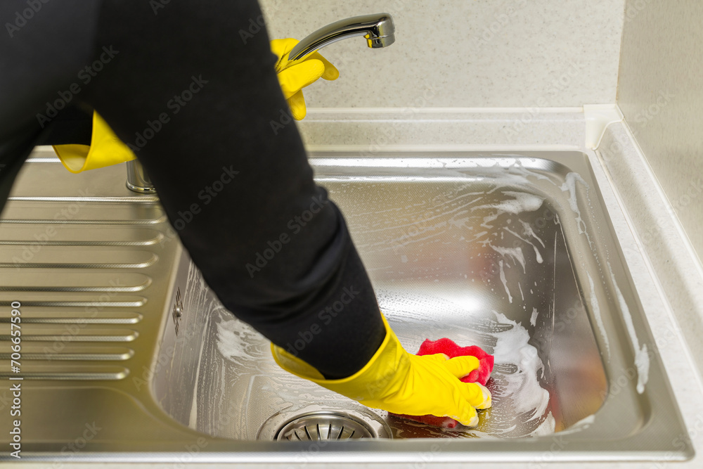 woman in rubber gloves washes the sink in the kitchen