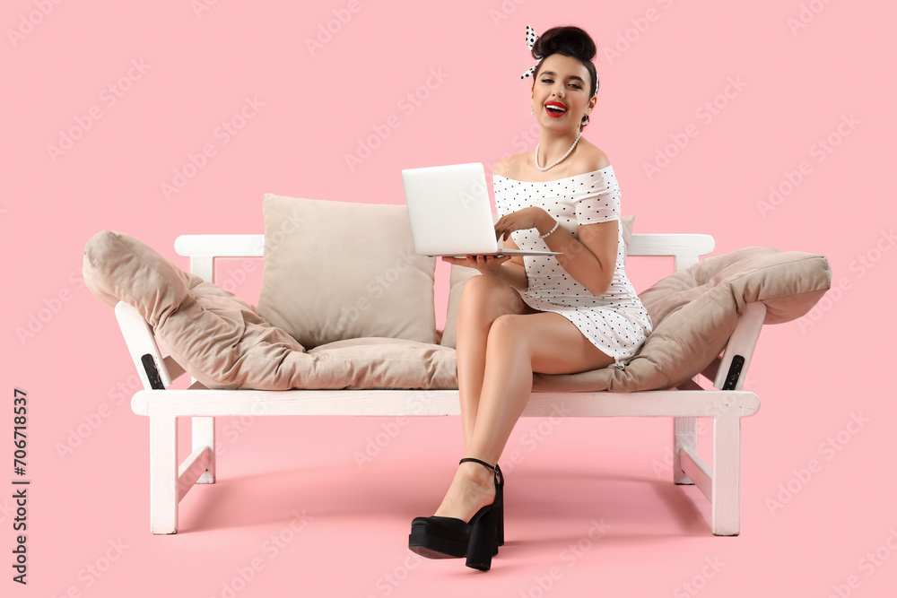 Young pin-up woman using laptop on sofa against pink background