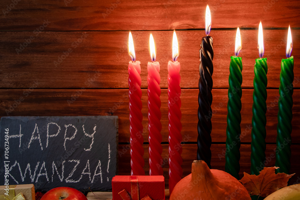 Kwanzaa African American holiday. Seven candles on wooden background.