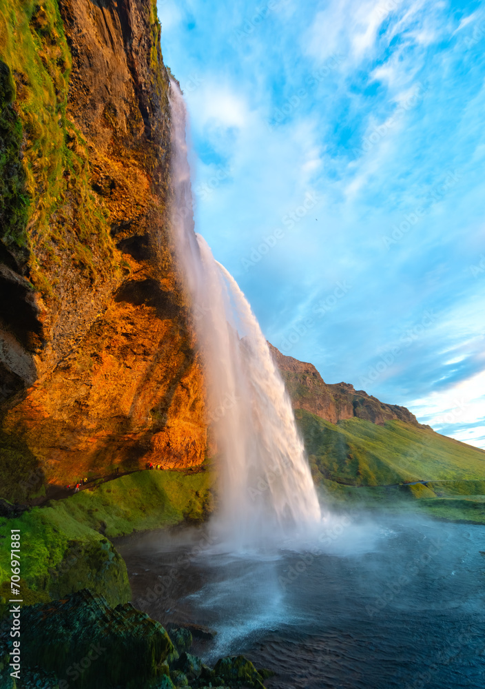 Seljalandsfoss is an impressive cascade on the south coast of Iceland. Majestic waterfall in warm evening sun in midsummer. Colorful scenery and major tourist attraction in wild volcanic nature.