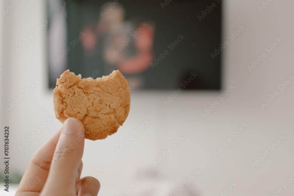 Image of woman hand holding bitten cookie biscuit while watching tv, eating and spending time on white bed in free day. lifestyle concept.
