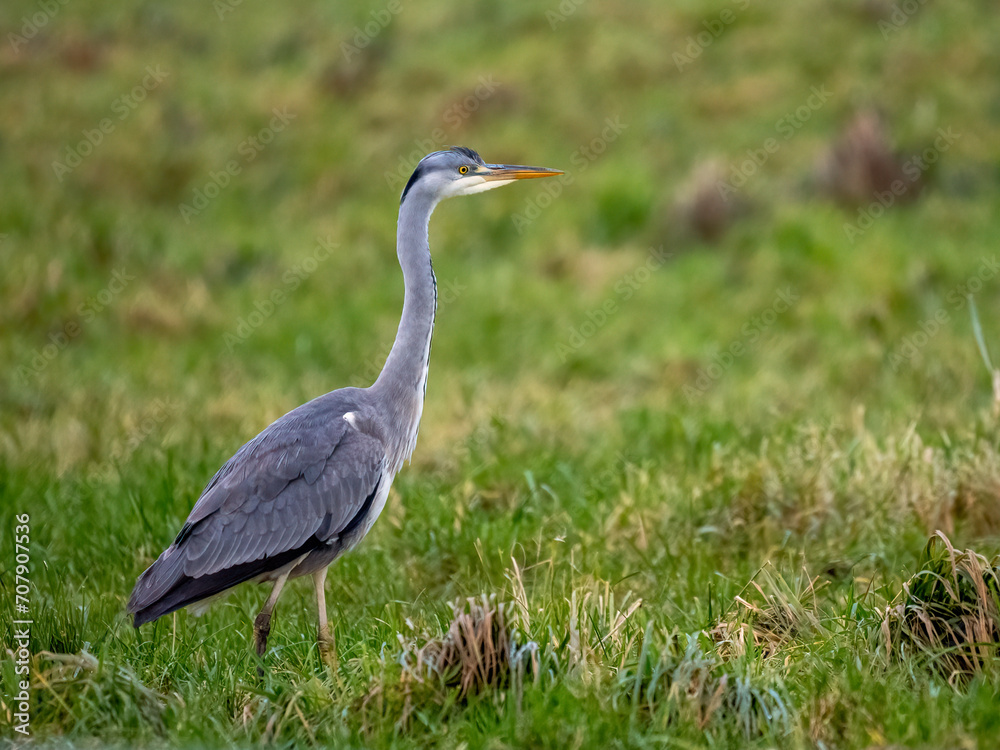 Graureiher (Ardea cinerea) Mäusejagd auf Viehweide