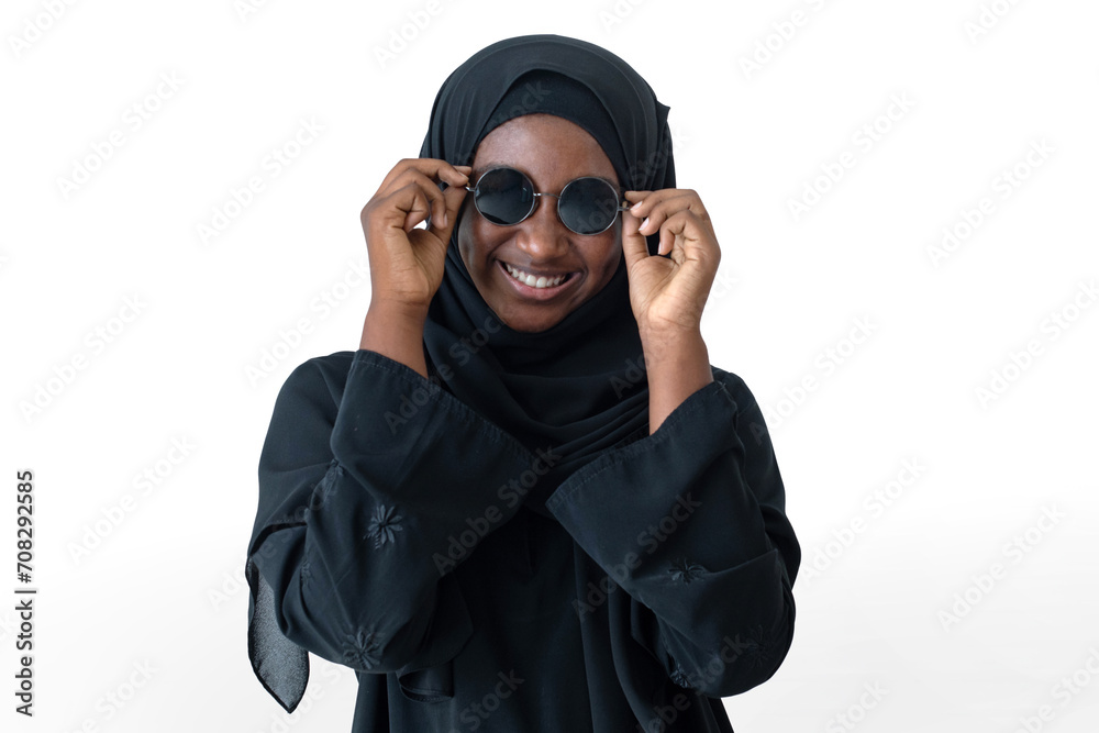 Happy African Muslim girl in black Hijab wearing sun glasses and smiling at camera