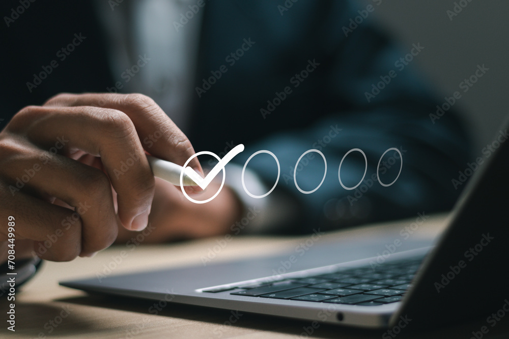Businessman fill out business checklist survey to track business performance, filling out digital form checklist, take an assessment, questionnaire.