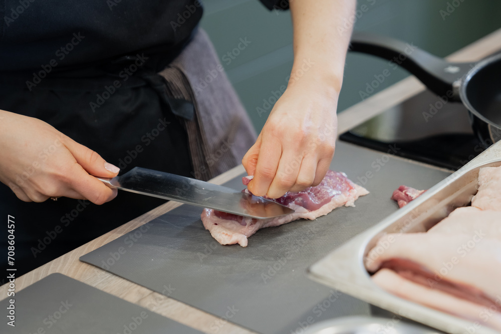 Chef preparing duck breast by cutting it with knife on a cutting board in professional kitchen