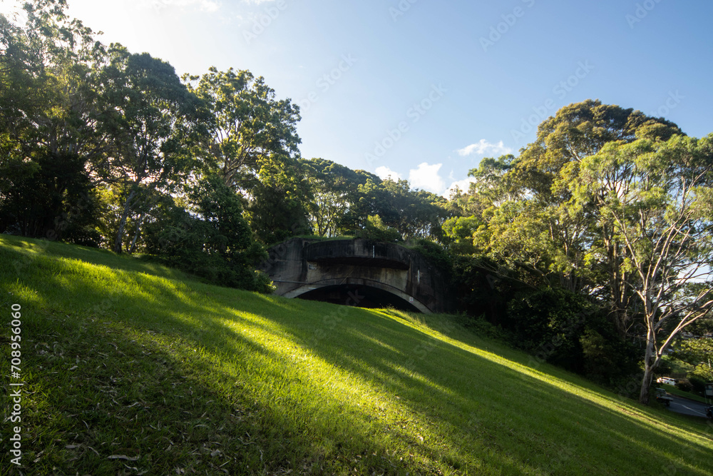 Distant Abandoned World War II Bunker on a hill on sunny day
