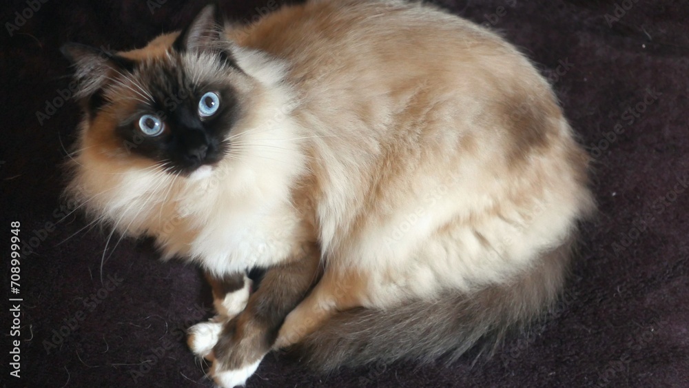 Ragdoll cat, fluffy feline pet, seal point mitted pedigree breed