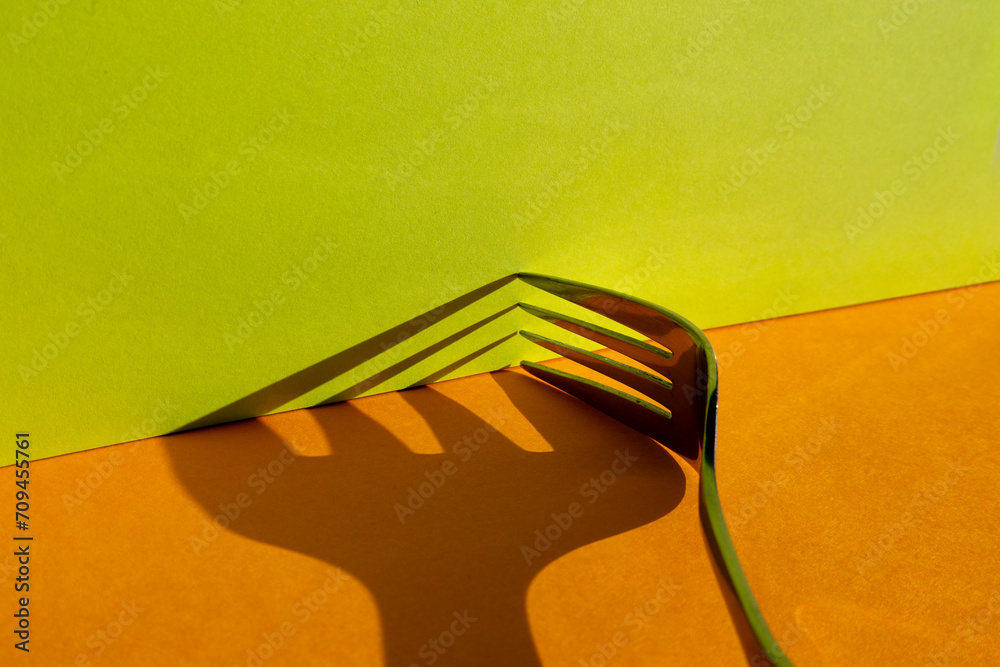 Close-up studio shot of the shadow of the tines of a fork on an orange and lime green background.