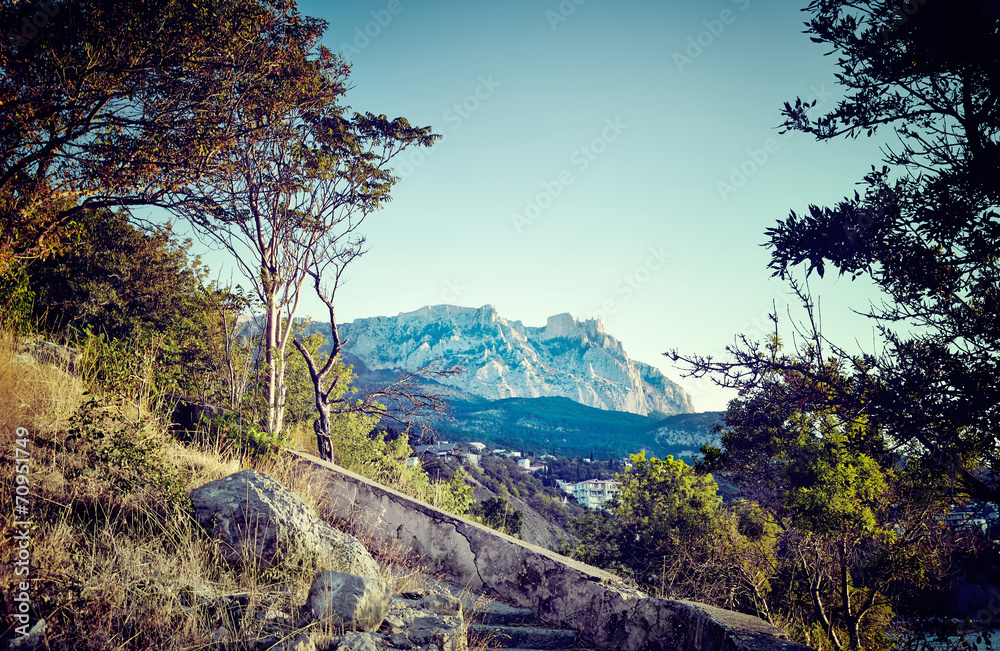 Tree and sea at sunset. Crimea landscape