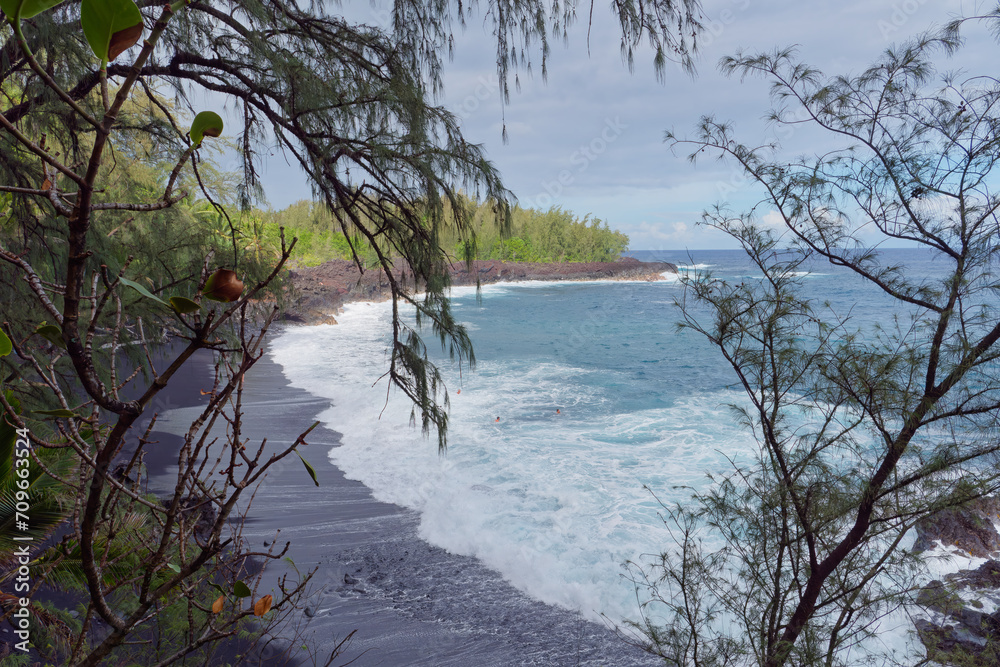 View of the beautiful Kehena black sand beach located in the Big Island's Puna district, Hawaii